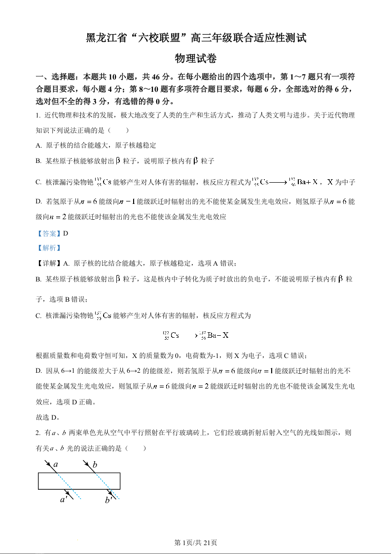 黑龙江省六校联盟2024届高三下学期联合性适应测试物理(精品解析版)