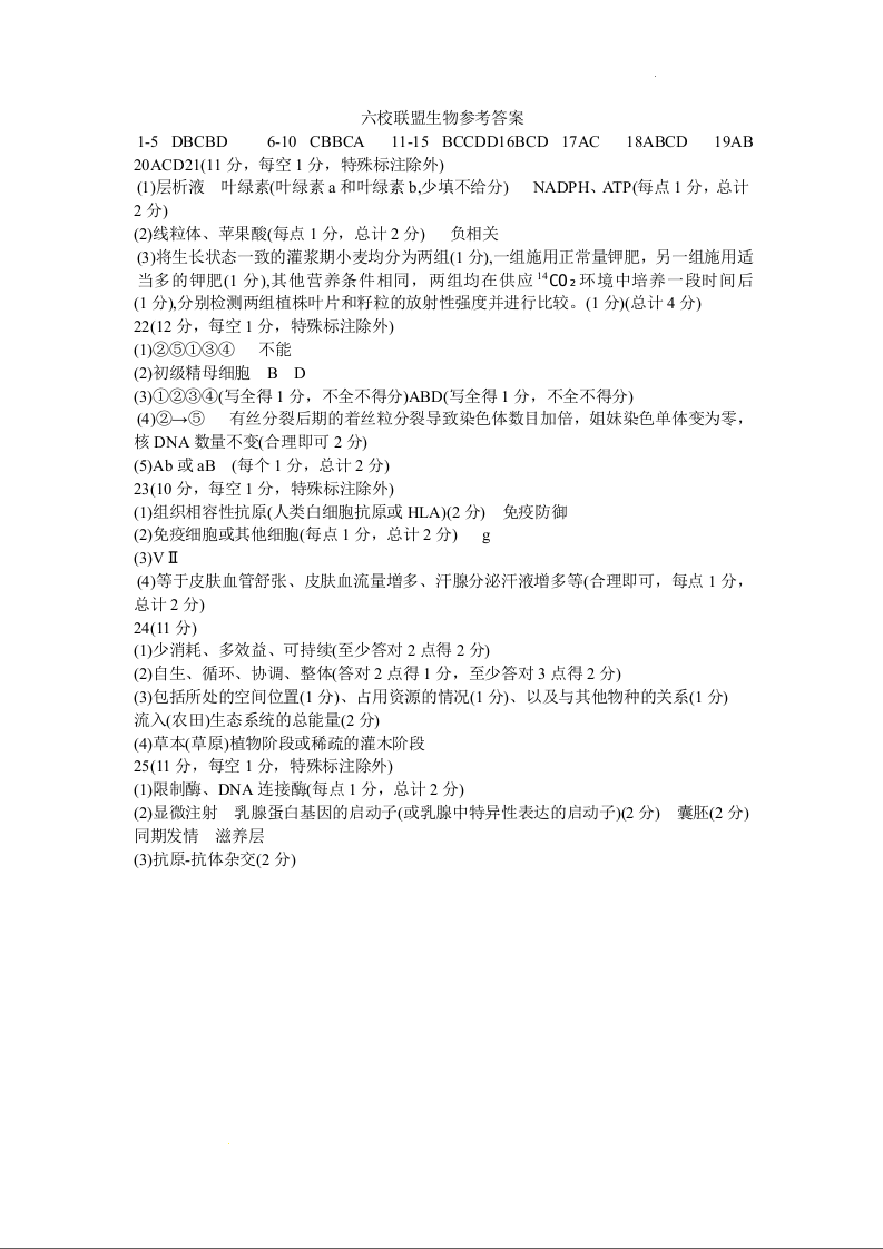 黑龙江省六校联盟2024届高三下学期联合性适应测试生物答案