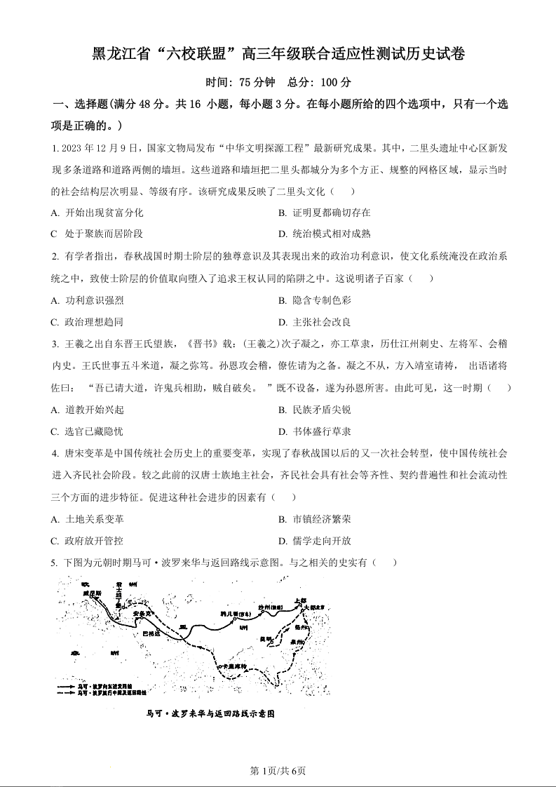 黑龙江省六校联盟2024届高三下学期联合性适应测试历史(原卷版)