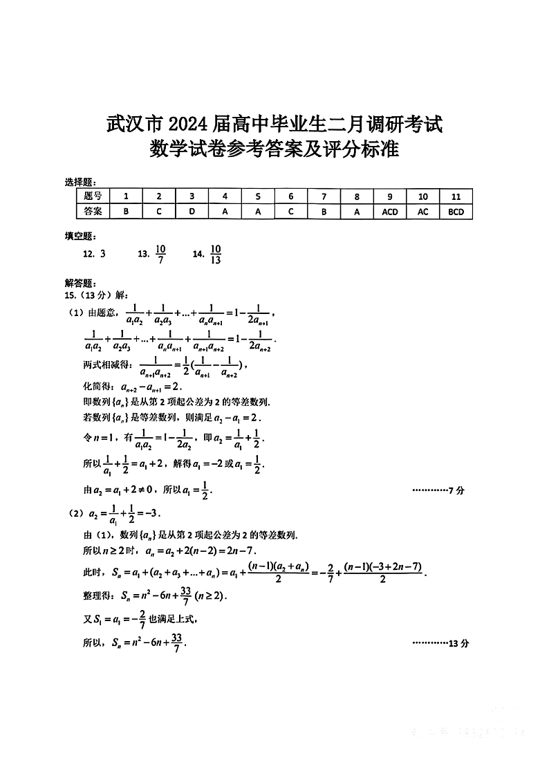湖北省武汉市2024届高三二月调研考试数学答案