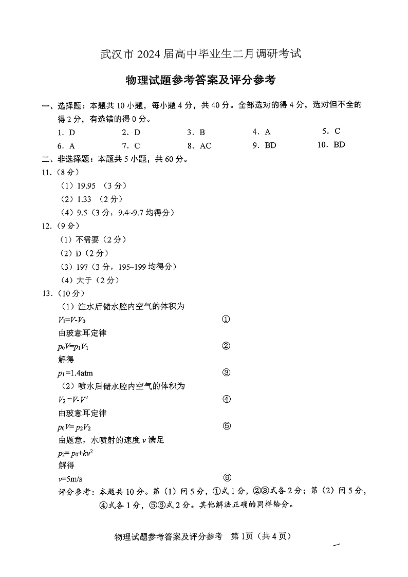 湖北省武汉市2024届高三二月调研考试物理答案