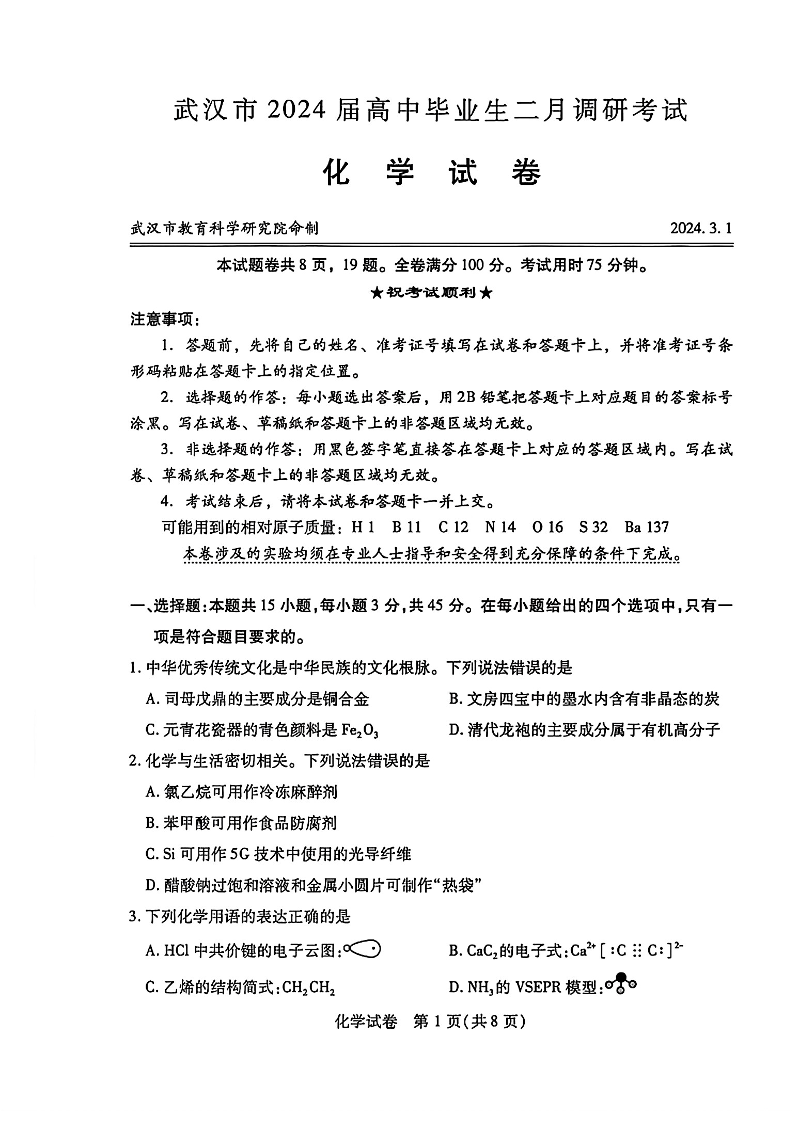 湖北省武汉市2024届高三二月调研考试化学