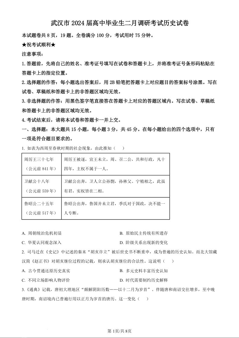 湖北省武汉市2024届高三二月调研考试历史(原卷版)