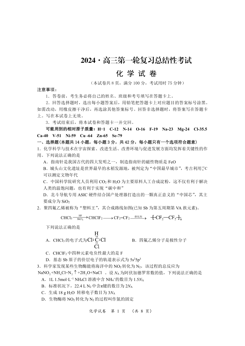 湖南省2024届高三下学期一轮复习总结性考试化学