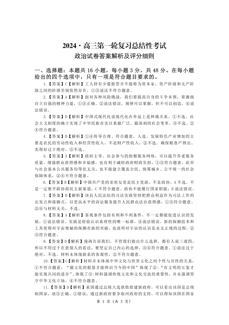 湖南省2024届高三下学期一轮复习总结性考试政治答案