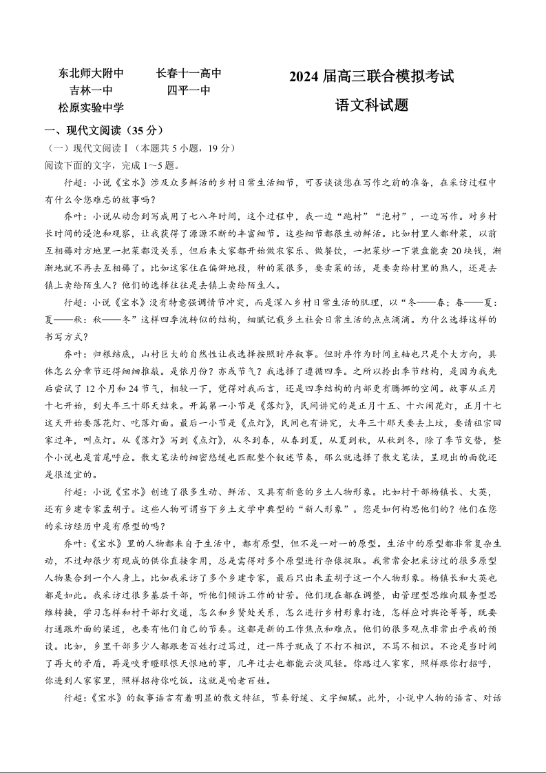 吉林省东北师大附中、长春市十一高中、吉林一中、四平一中、松原实验中学2024届高三上学期1月联合模拟考试语文