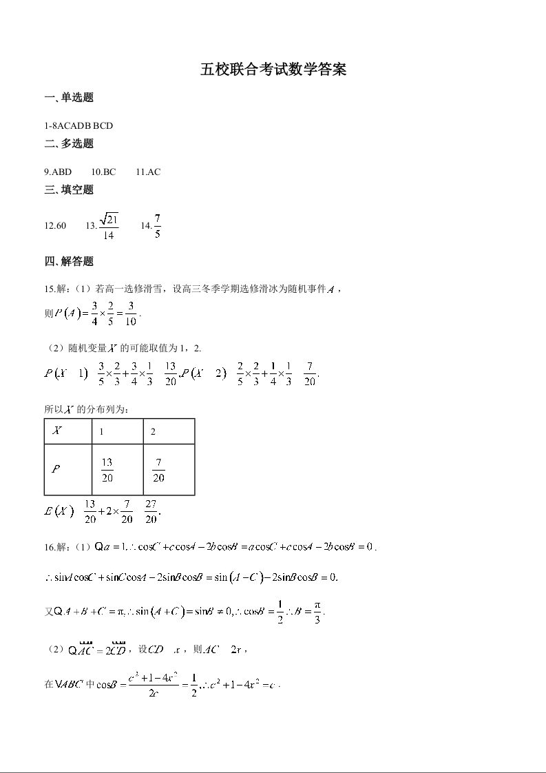 吉林省东北师大附中、长春市十一高中、吉林一中、四平一中、松原实验中学2024届高三上学期1月联合模拟考试数学答案