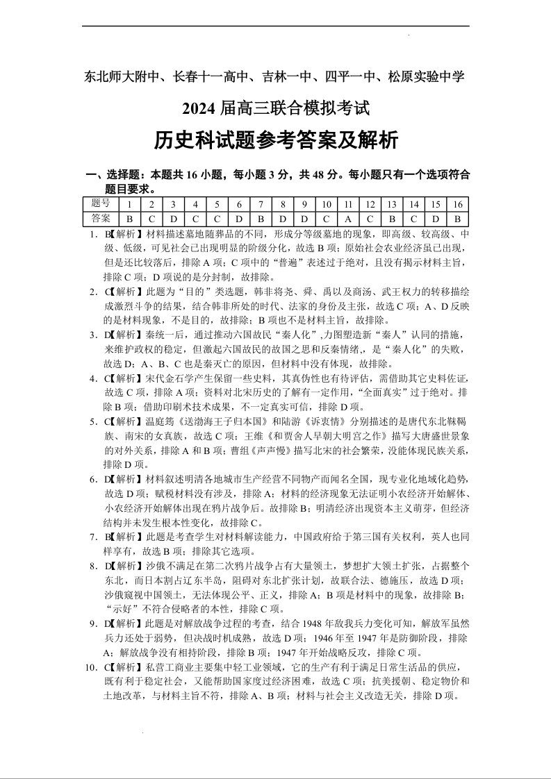 吉林省东北师大附中、长春市十一高中、吉林一中、四平一中、松原实验中学2024届高三上学期1月联合模拟考试 历史答案