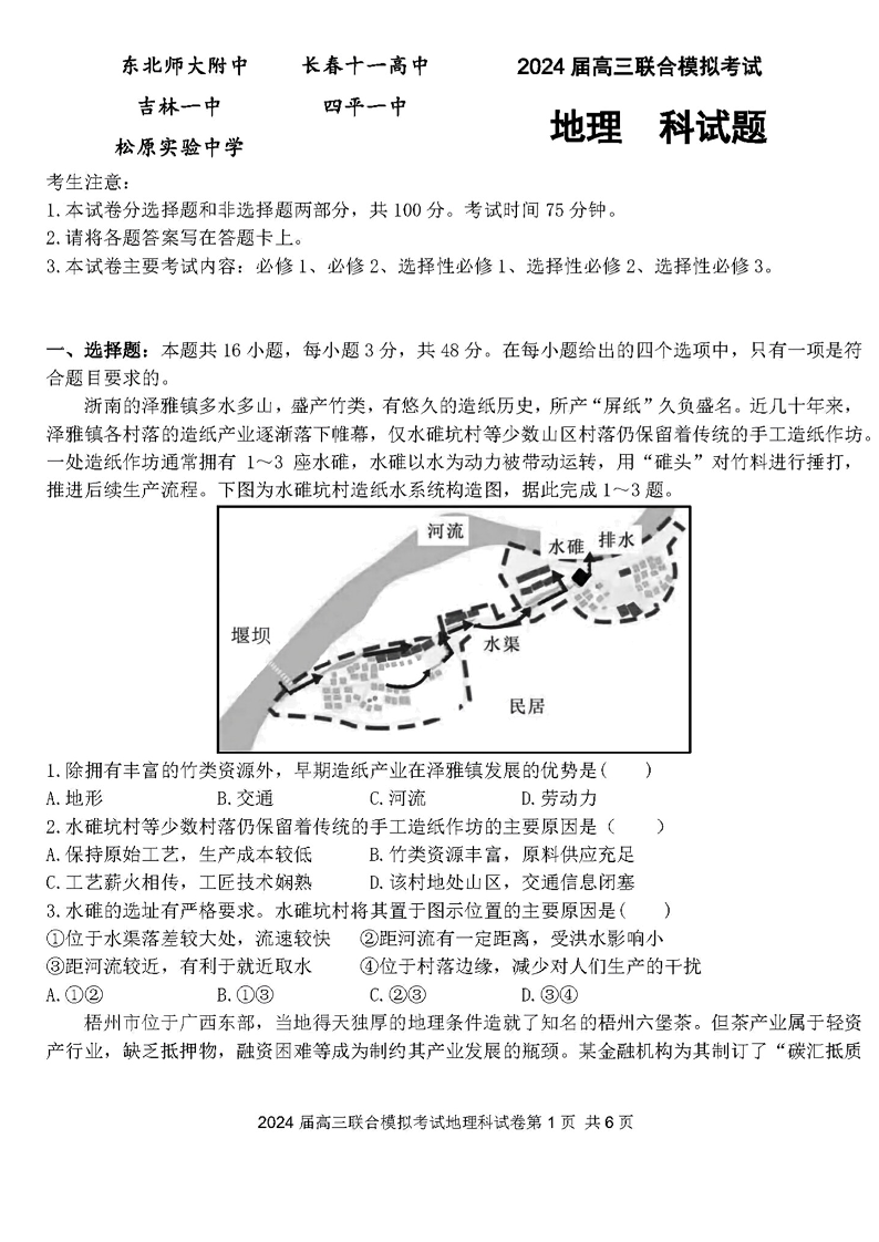 吉林省东北师大附中、长春市十一高中、吉林一中、四平一中、松原实验中学2024届高三上学期1月联合模拟考试地理+答案