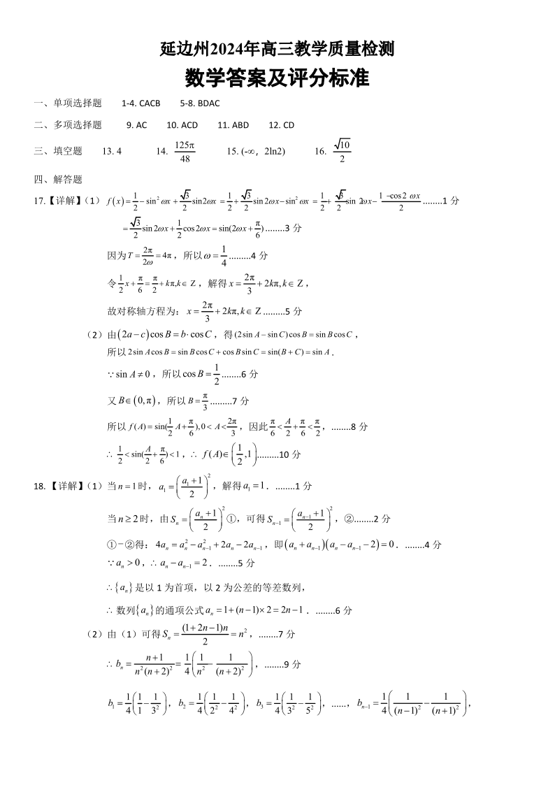 吉林省延边州2024届高三教学质量检测(一模)数学答案