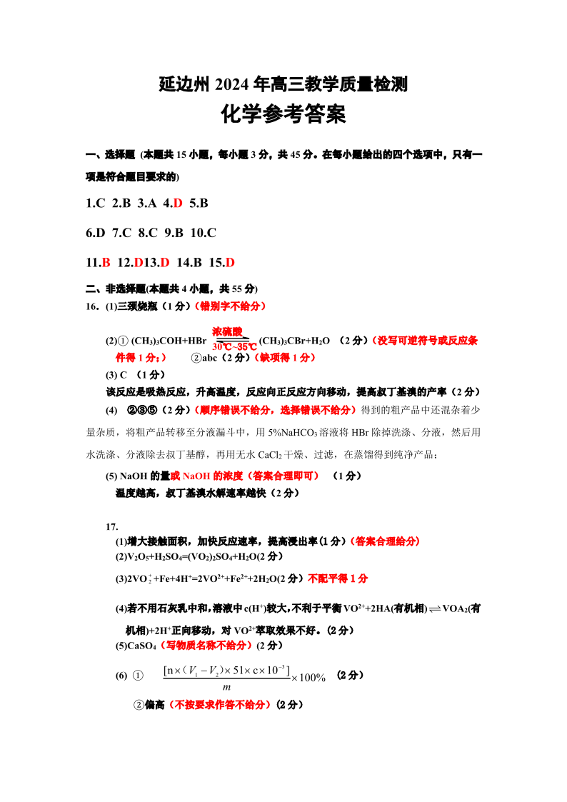 吉林省延边州2024届高三教学质量检测(一模)化学答案