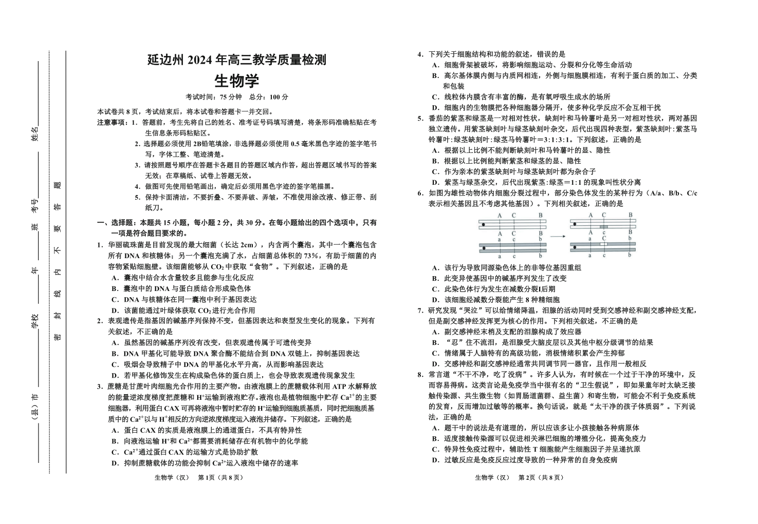 吉林省延边州2024届高三教学质量检测(一模)生物