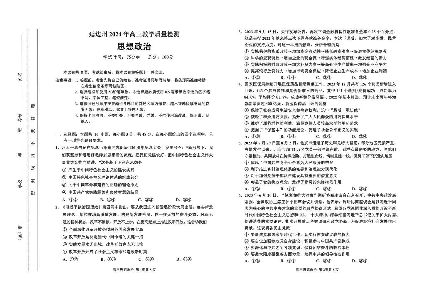吉林省延边州2024届高三教学质量检测(一模)政治