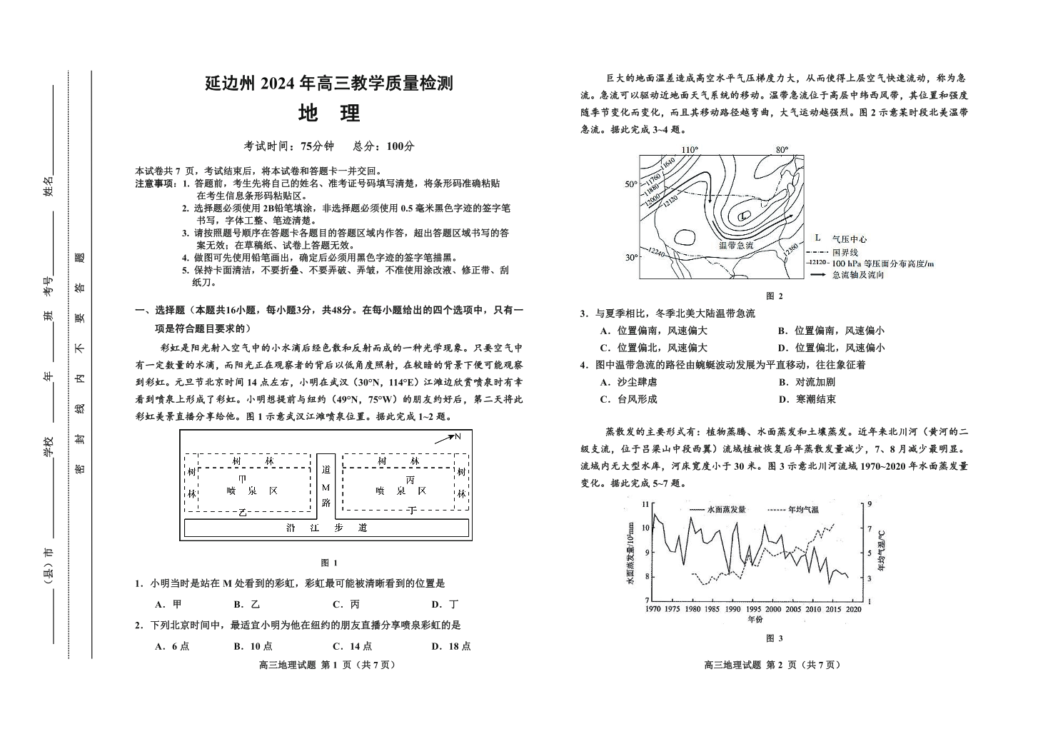 吉林省延边州2024届高三教学质量检测(一模)地理