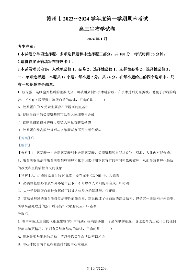 江西省赣州市2024届高三上学期期末考试生物(精品解析版)