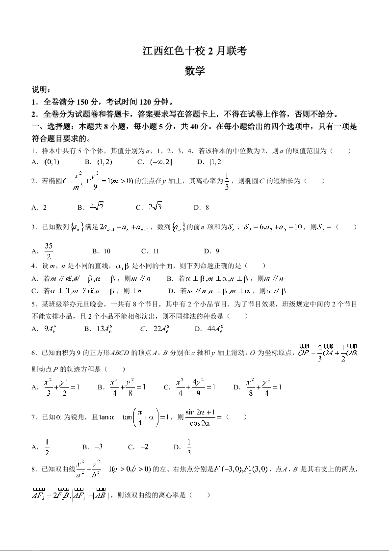 江西省红色十校2024届高三下学期2月联考数学