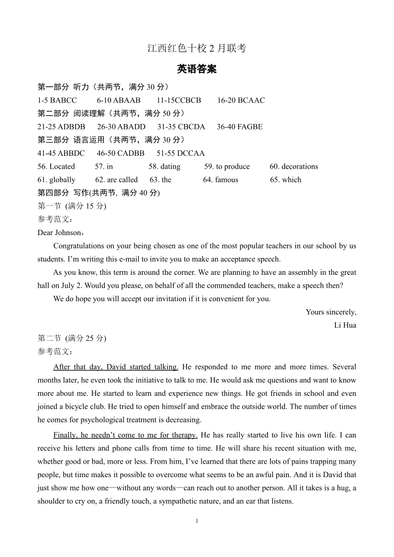 江西省红色十校2024届高三下学期2月联考英语答案