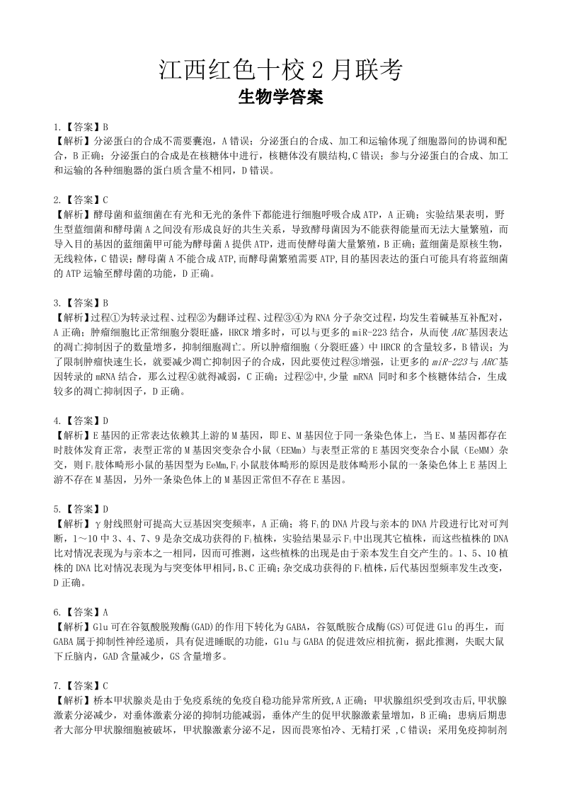 江西省红色十校2024届高三下学期2月联考生物答案