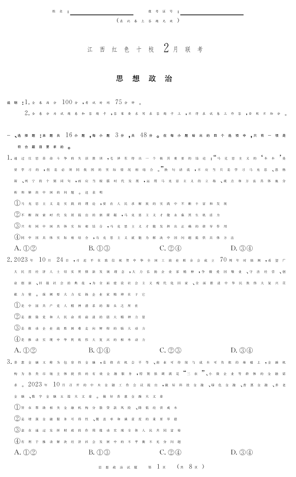 江西省红色十校2024届高三下学期2月联考政治