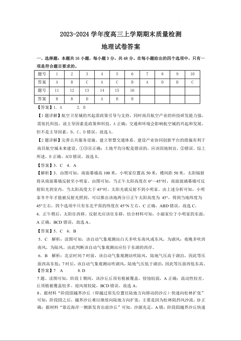 江西省新余市2024届高三上学期期末质量检测地理答案