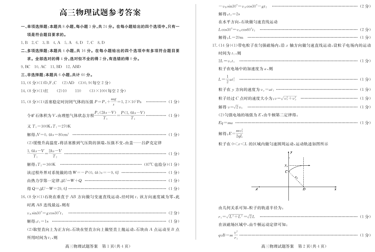 山东省德州市“优高联盟”2024届高三2月诊断性检测物理答案