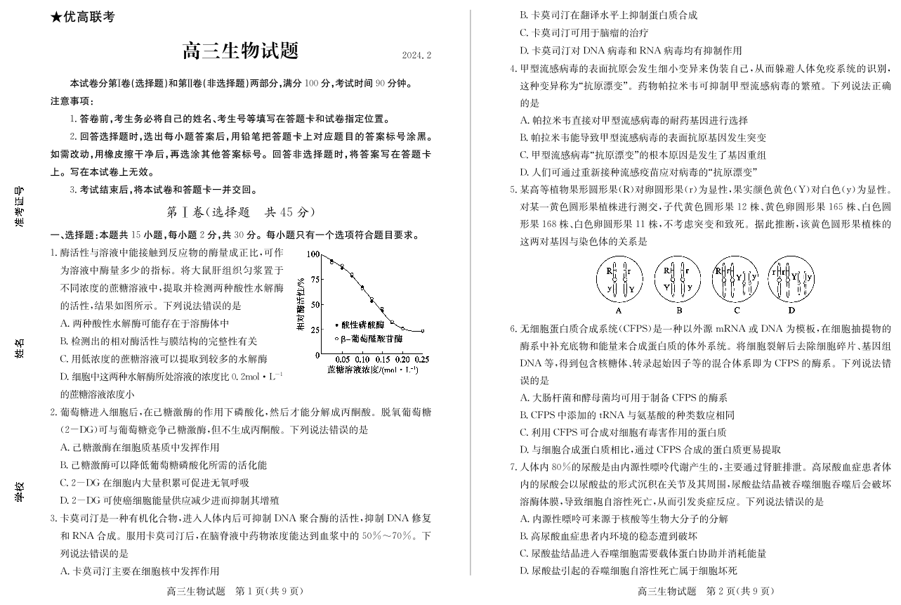 山东省德州市“优高联盟”2024届高三2月诊断性检测生物