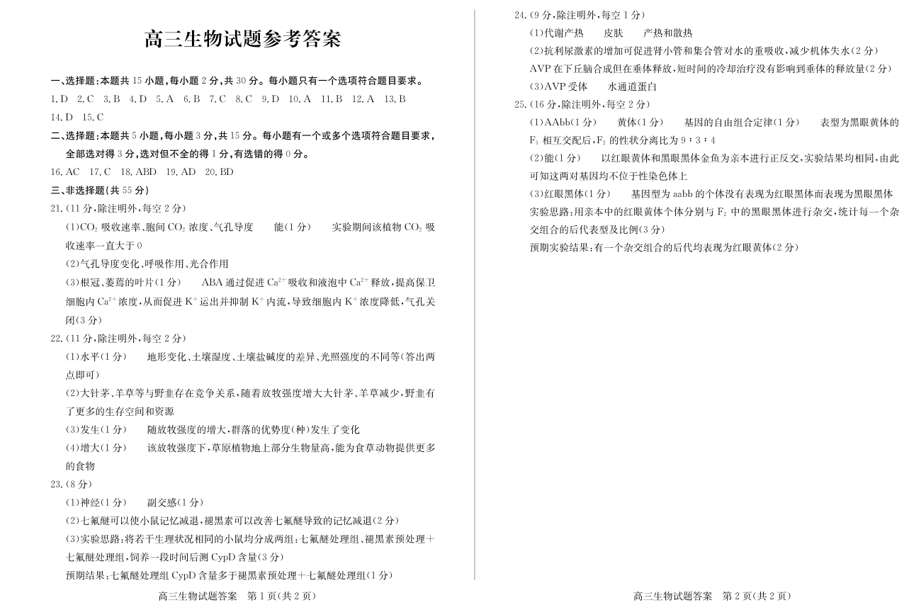 山东省德州市“优高联盟”2024届高三2月诊断性检测生物答案