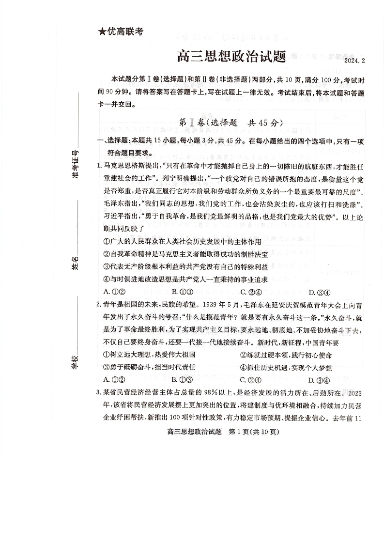山东省德州市“优高联盟”2024届高三2月诊断性检测政治