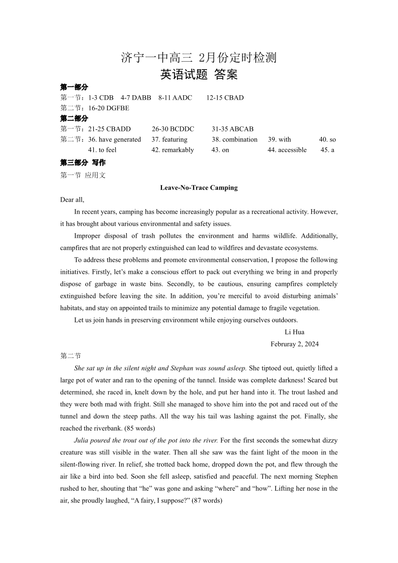 山东省济宁市第一中学2024届高三上学期2月定时检测(期末)英语答案