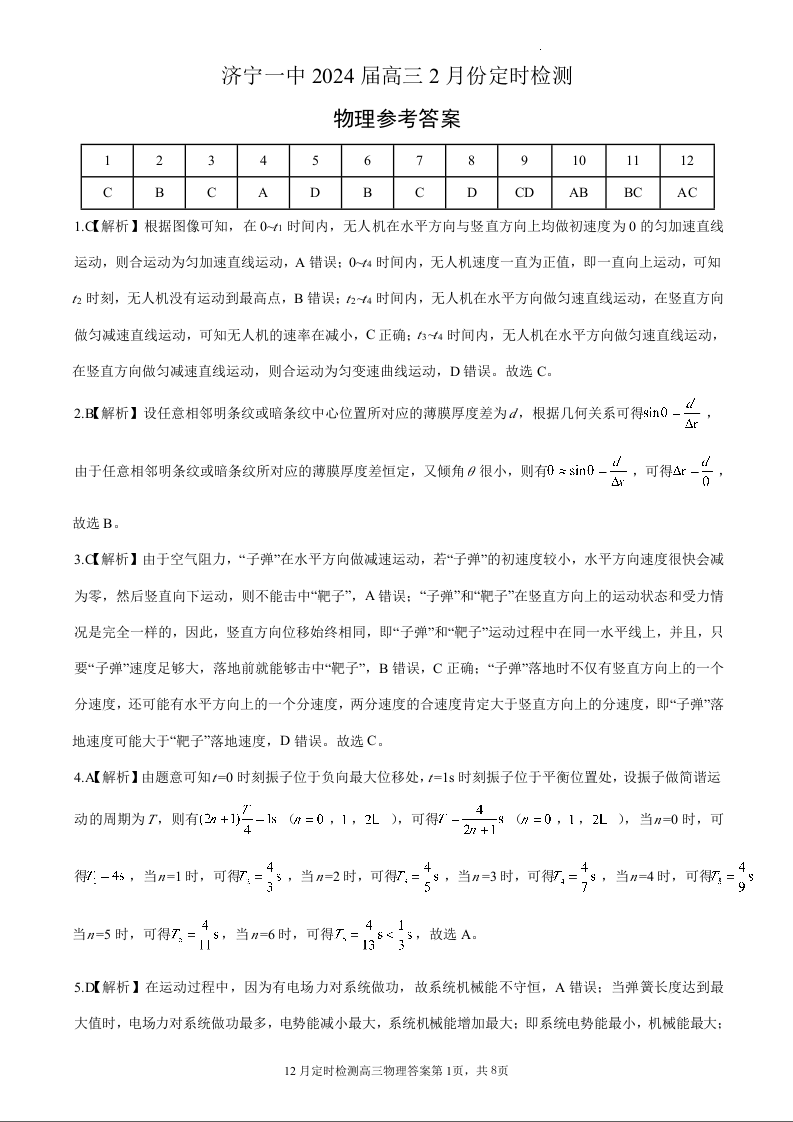 山东省济宁市第一中学2024届高三上学期2月定时检测(期末)物理答案