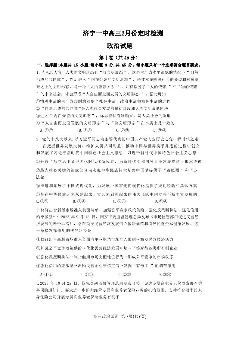 山东省济宁市第一中学2024届高三上学期2月定时检测(期末)政治