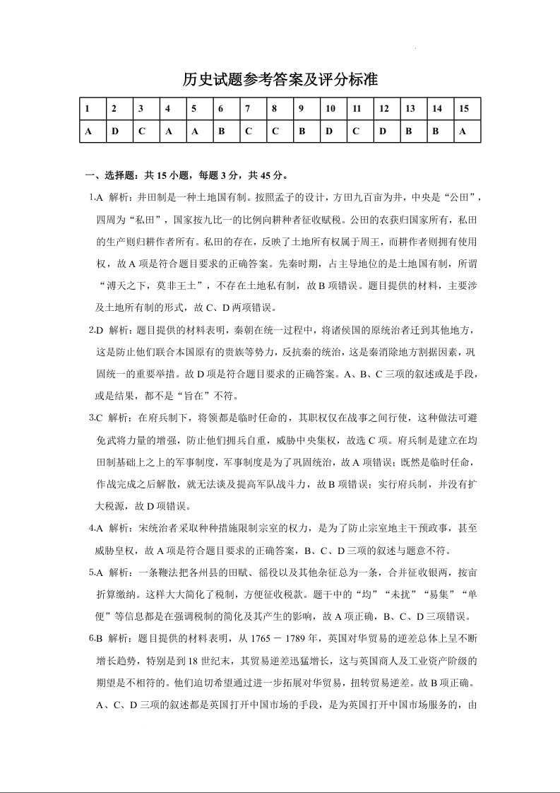 山东省济宁市第一中学2024届高三上学期2月定时检测(期末)历史答案