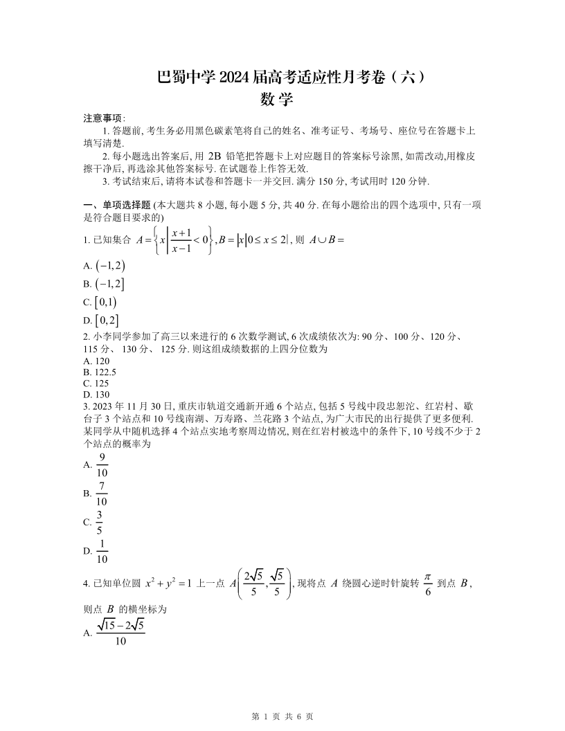 重庆市巴蜀中学2024 届高考适应性月考卷 (六)数学