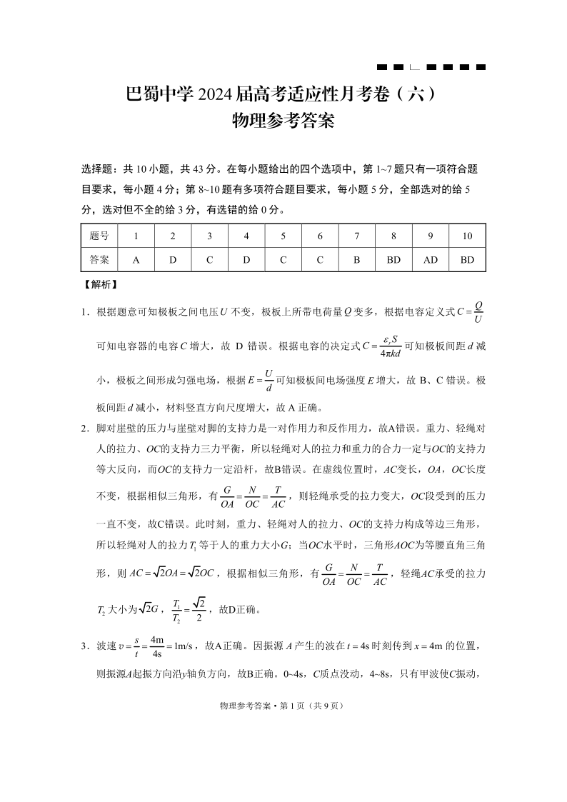 重庆市巴蜀中学2024 届高考适应性月考卷 (六)物理答案