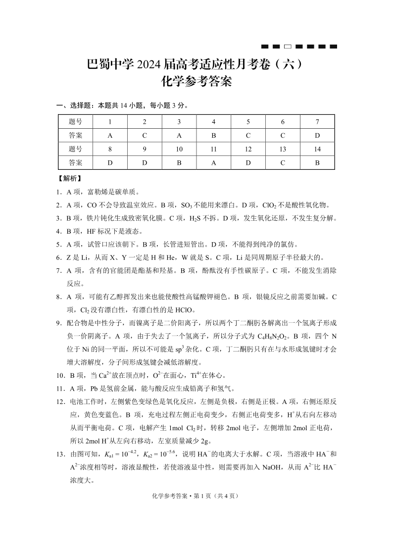 重庆市巴蜀中学2024 届高考适应性月考卷 (六)化学答案