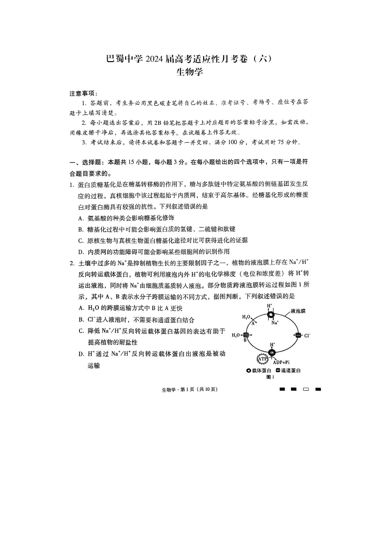 重庆市巴蜀中学2024 届高考适应性月考卷 (六)生物