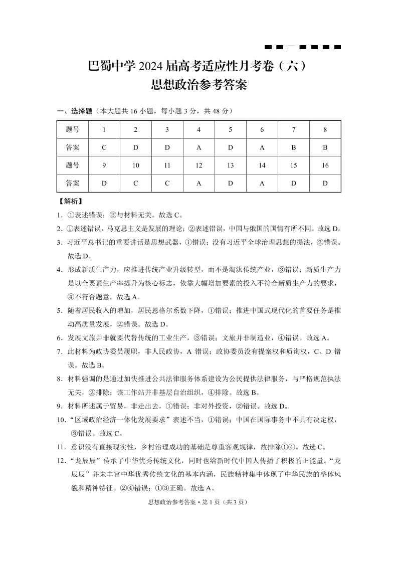 重庆市巴蜀中学2024 届高考适应性月考卷 (六)政治答案