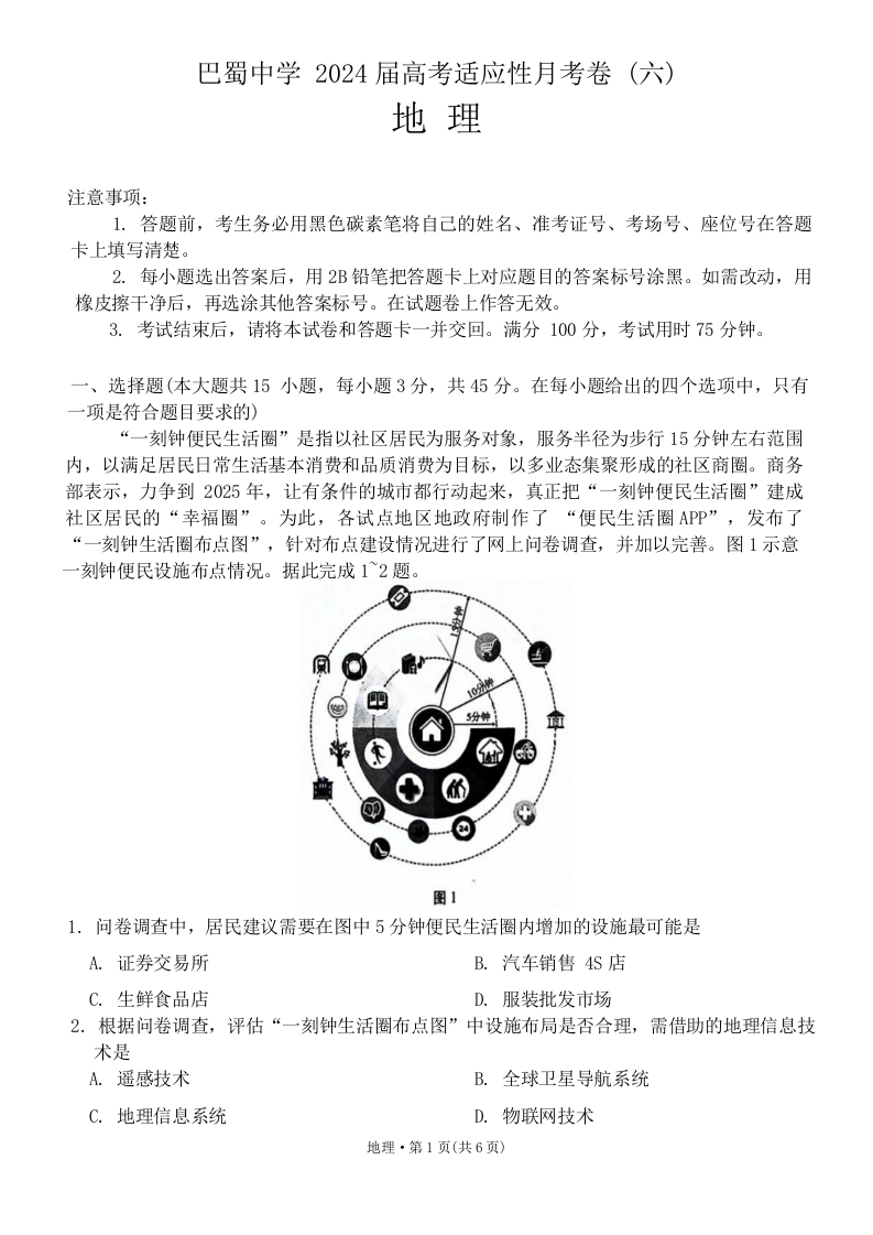 重庆市巴蜀中学2024 届高考适应性月考卷 (六)地理