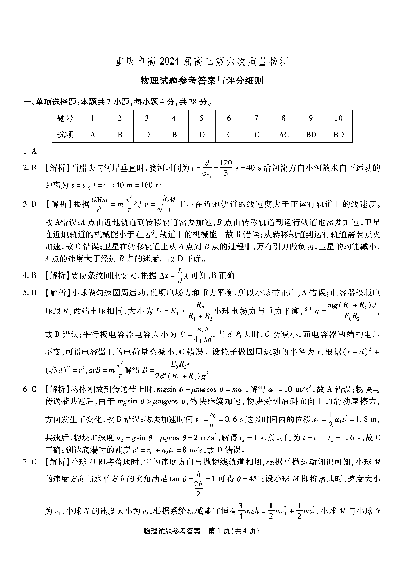 重庆市南开中学高2024届高三第六次质量检测物理答案