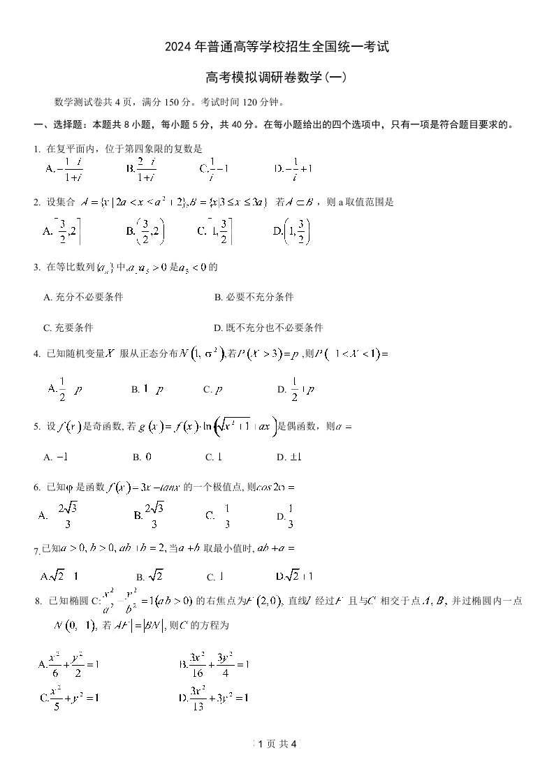 重庆康德2024年普通高等学校招生全国统一考试高考模拟调研卷(一)数学