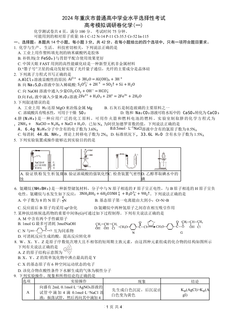 重庆康德2024年普通高等学校招生全国统一考试高考模拟调研卷(一)化学