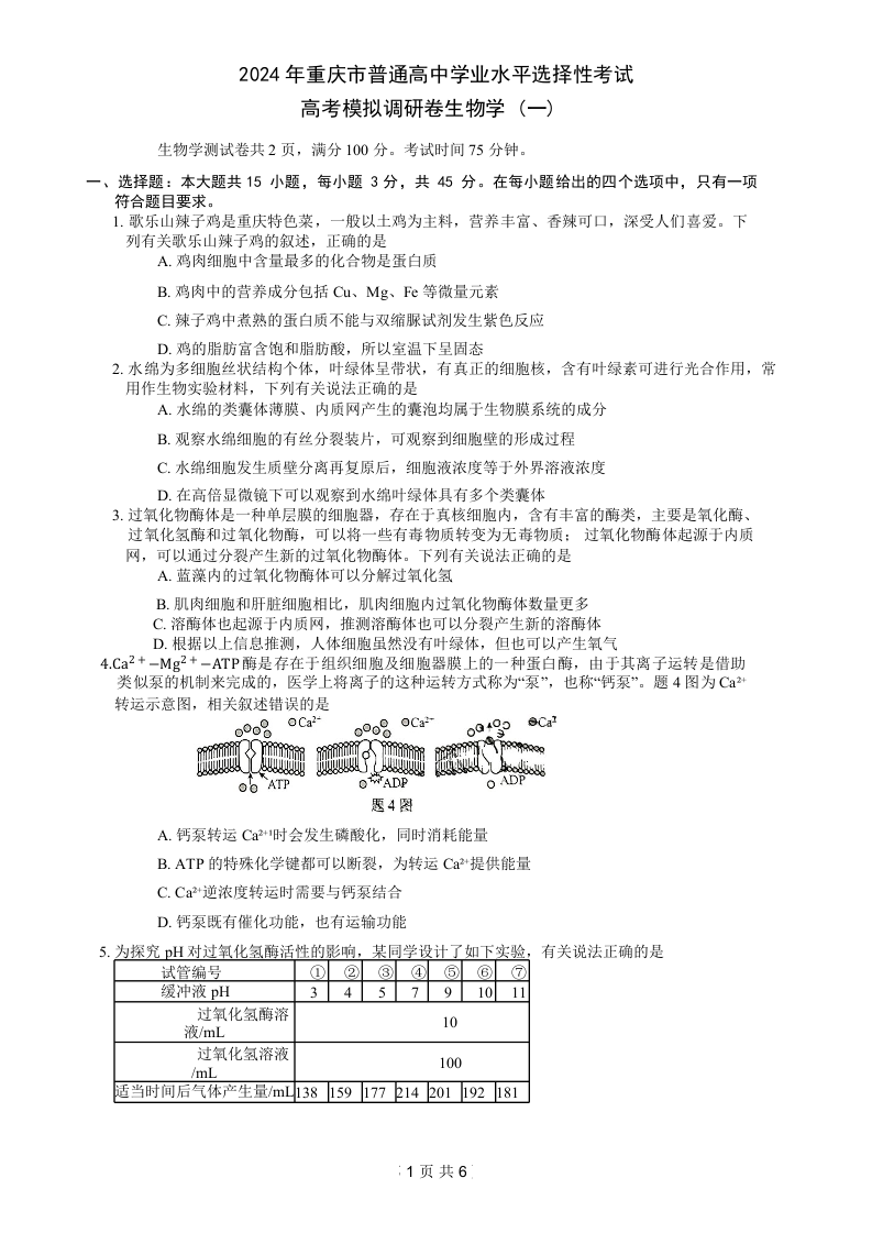 重庆康德2024年普通高等学校招生全国统一考试高考模拟调研卷(一)生物