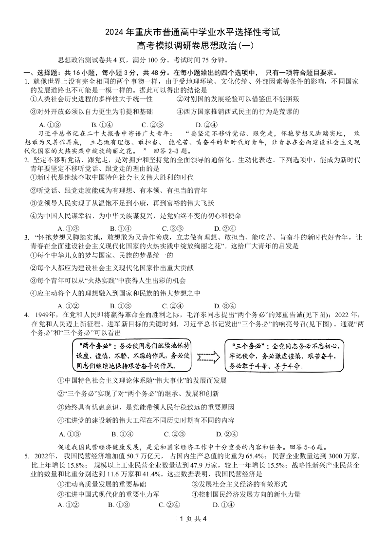 重庆康德2024年普通高等学校招生全国统一考试高考模拟调研卷(一)政治
