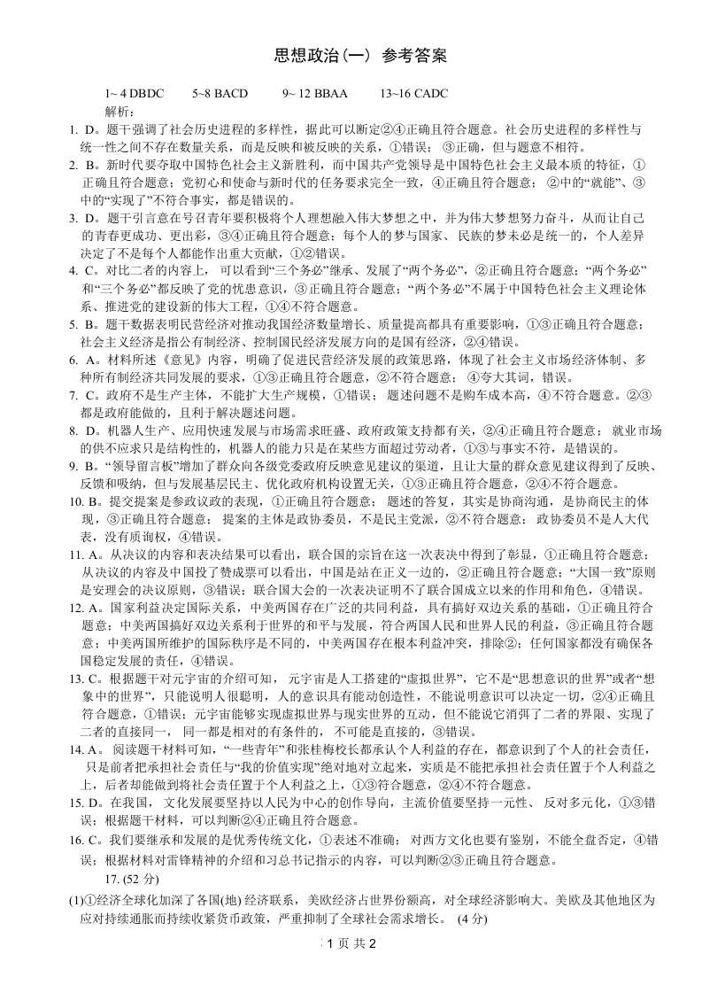 重庆康德2024年普通高等学校招生全国统一考试高考模拟调研卷(一)政治答案