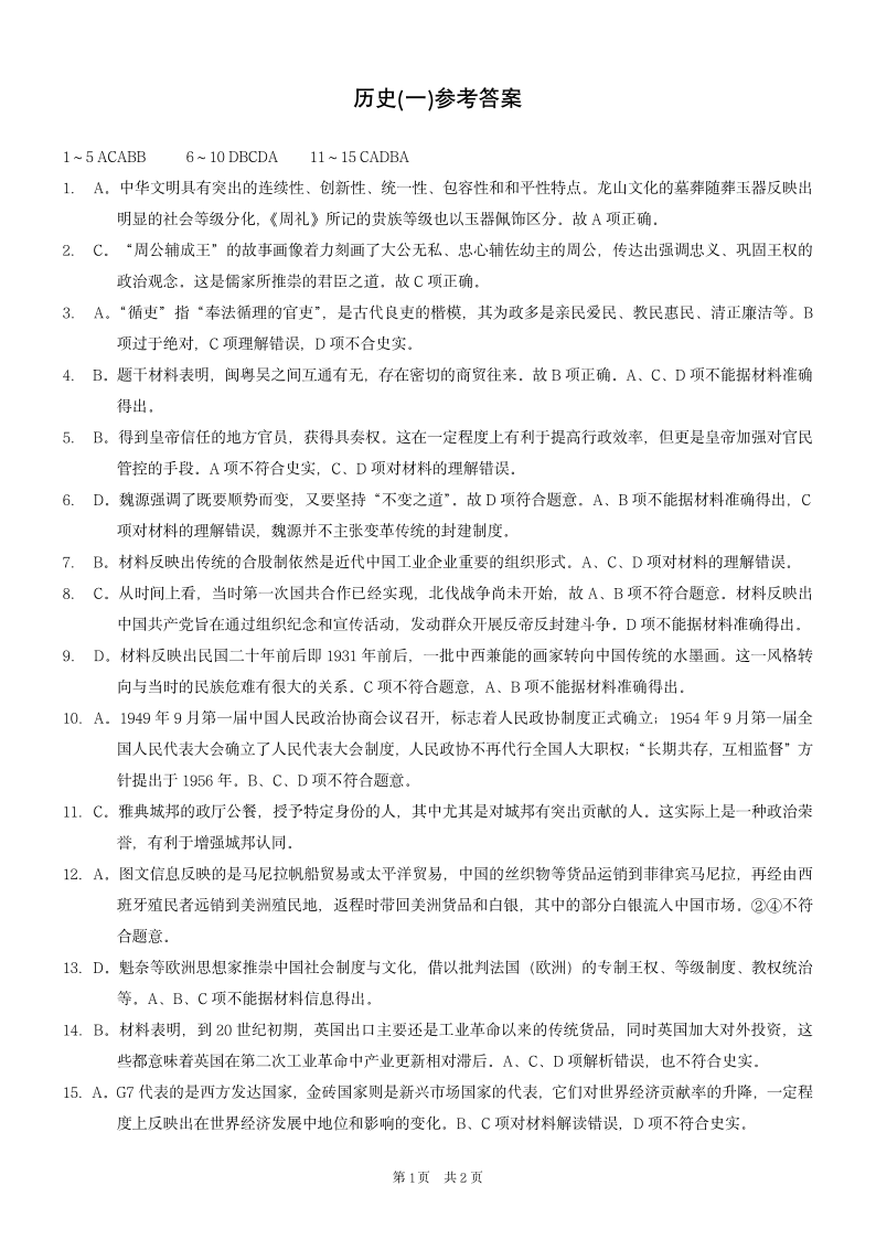 重庆康德2024年普通高等学校招生全国统一考试高考模拟调研卷(一)历史答案