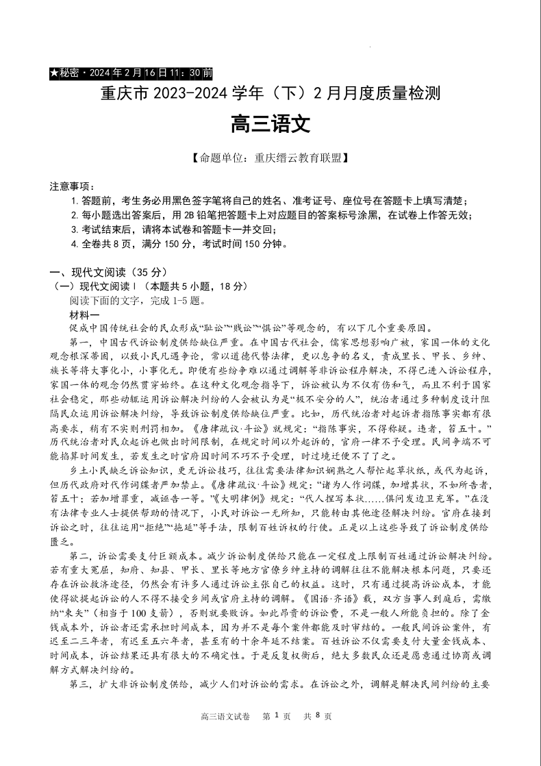 重庆市缙云教育联盟2024届高三下学期2月月度质量检测语文