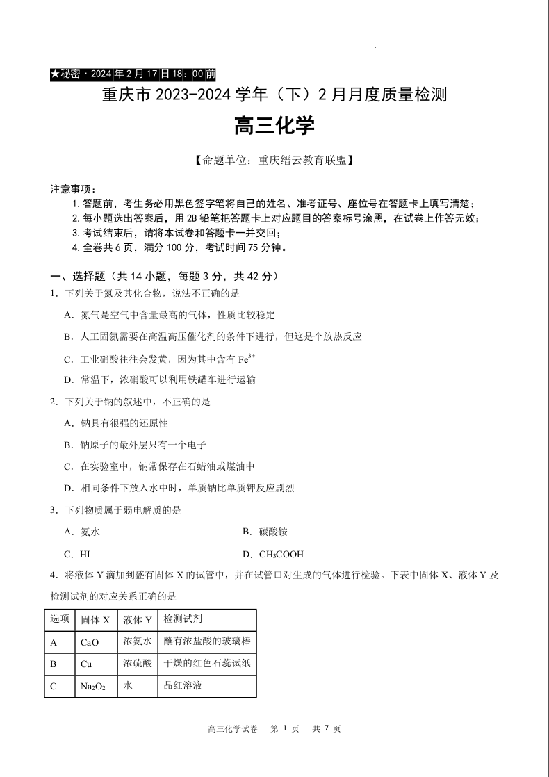 重庆市缙云教育联盟2024届高三下学期2月月度质量检测化学
