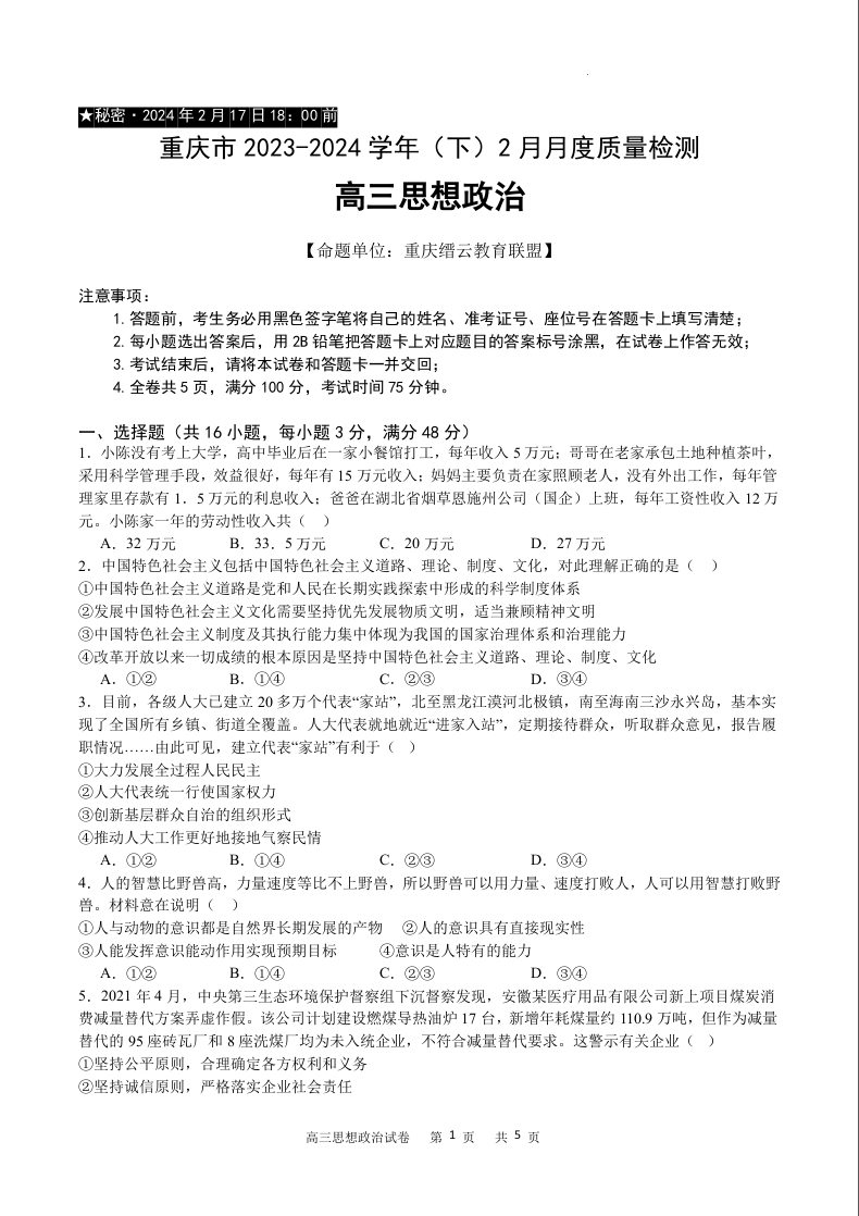重庆市缙云教育联盟2024届高三下学期2月月度质量检测政治