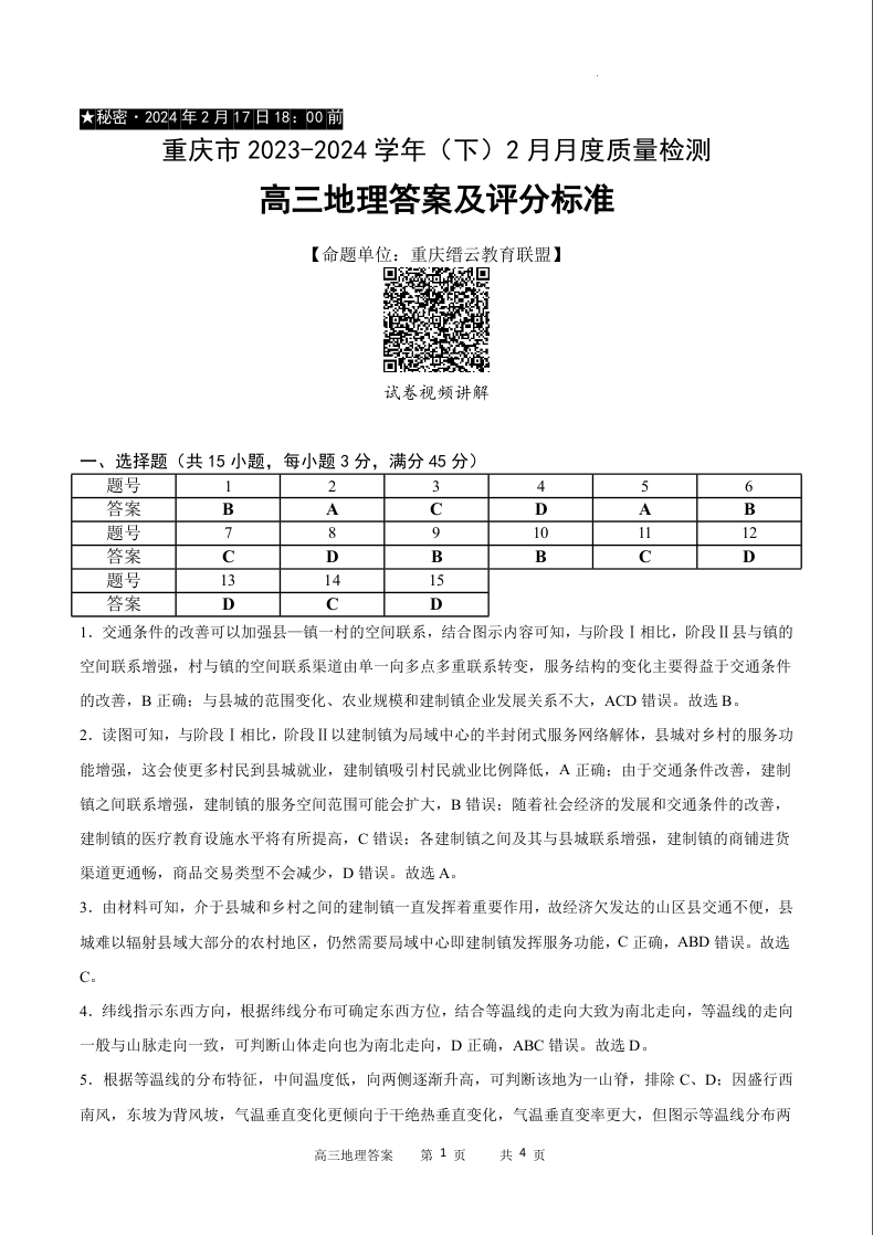 重庆市缙云教育联盟2024届高三下学期2月月度质量检测地理答案