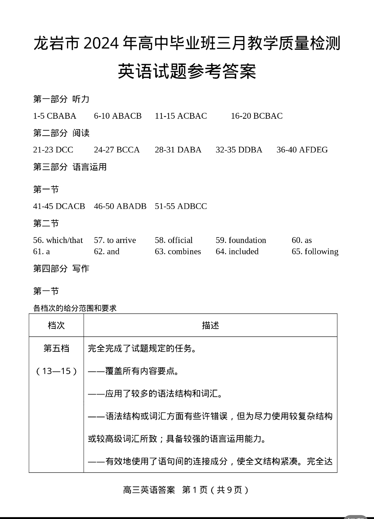 福建省龙岩市2024届高三下学期3月份质量检测一模英语答案
